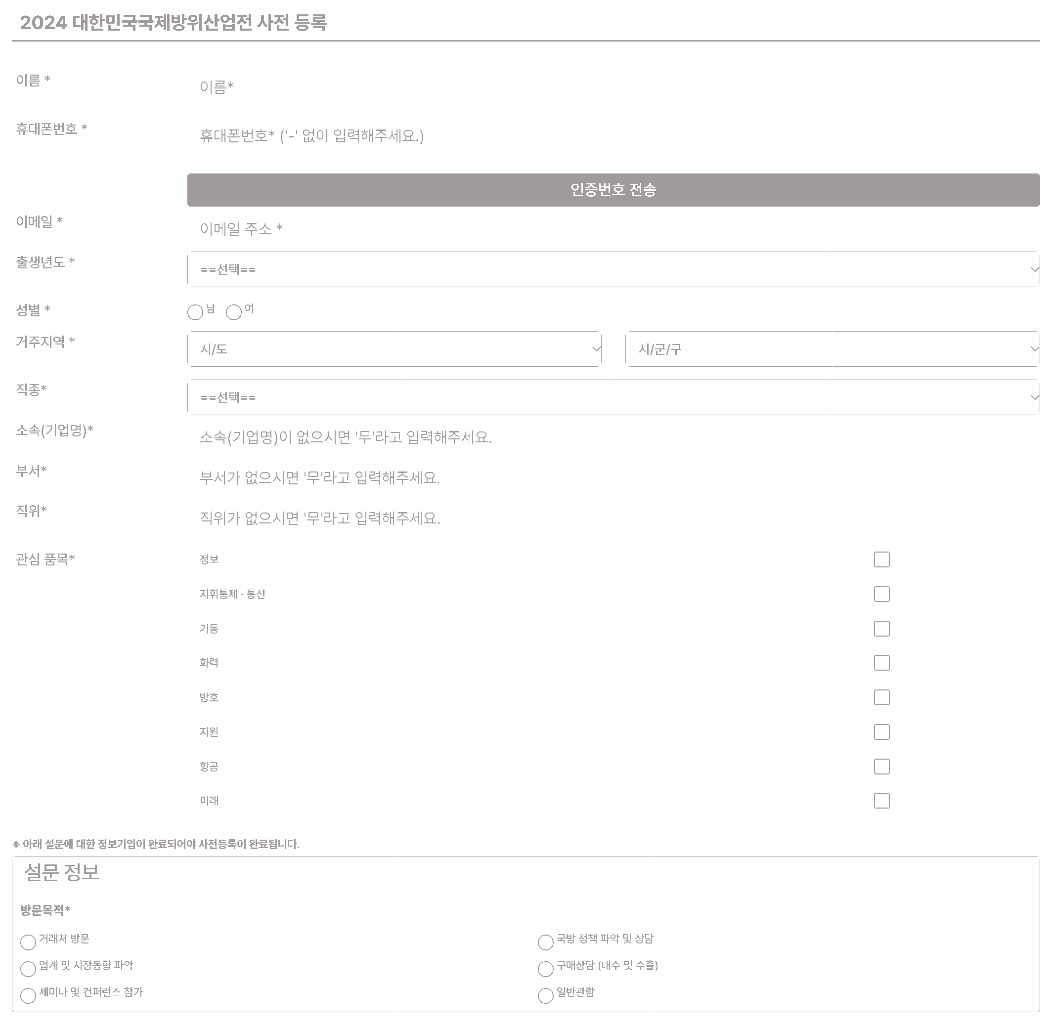 두번째 페이지가 본격적으로 정보를 입력하는 창입니다. 이름과 휴대폰번호 이메일과 성별, 거주지 등을 넣어주시면 됩니다. 유의하실 점은 소속 기업명과 부석, 직위를 입력하는 칸이 있는데, 입력을 원치 않으실 경우 '무'라고 입력하고 넘어가 주시면 됩니다.