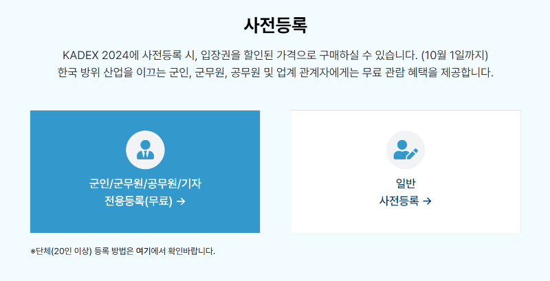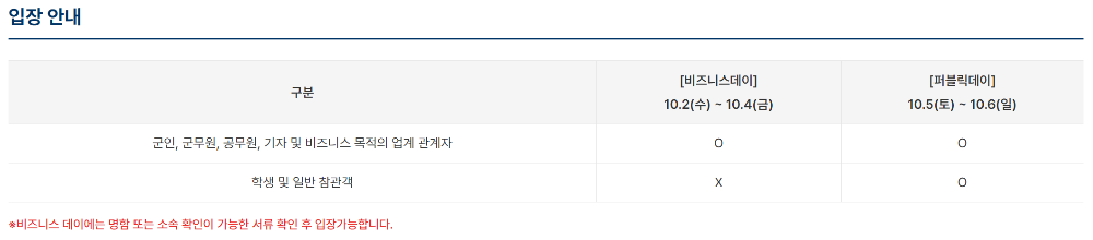 결론부터 말씀드리면 군인, 공무원, 기타 업계 관계자가 아니더라도 KADEX 참관이 가능합니다. 하지만 중요한 점이 있는데 KADEX 전체 일정은 10월 2일부터 10월 6일까지 총 5일이지만 2일부터 4일까지는 비즈니스데이로 일반인은 참관이 불가능해요. 일반인은 10월 5일과 6일, 이틀간의 퍼블릭데이에만 입장이 가능하십니다. 좀 아쉽긴 하지만 5일과 6일이 각각 토요일과 일요일이니 주말 나들이 간다는 마음으로 다녀오시면 좋을 것 같아요.