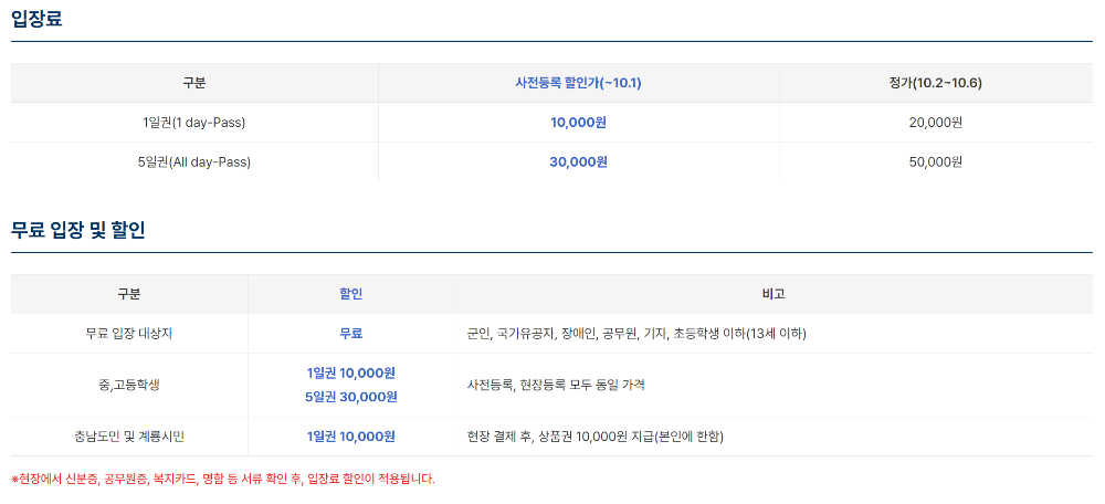여러분이 무료 입장 대상자도 아니고 충남도민도 아니실 경우에는 어떻게 해야 할까요? 앞선 어디에도 적용이 안되는 분들이더라도 사전등록을 하시면 1일권은 1만원, 5일권은 3만원에 구매가 가능합니다.